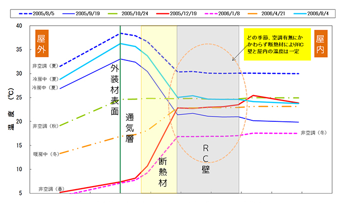 | グローバルマンションLLHは、2005年3月ツヅキが施主となり、外断熱工法の有効性を立証するために実際に施工した賃貸マンションです。 実測実験を目的として施工したため、RC内に無数の温湿度計などのセンサーを埋め込んだ外断熱工法の建築物の国内唯一の実例です。 長期間において温度、湿度など様々な実測実験を行いました。 測定期間:2005年8月~2006年の1年間 研究名:熱・湿気環境の長期実測に基づく外断熱使用外壁の性能評価 監 修:京都工芸繊維大学 准教授 芝池英樹 |